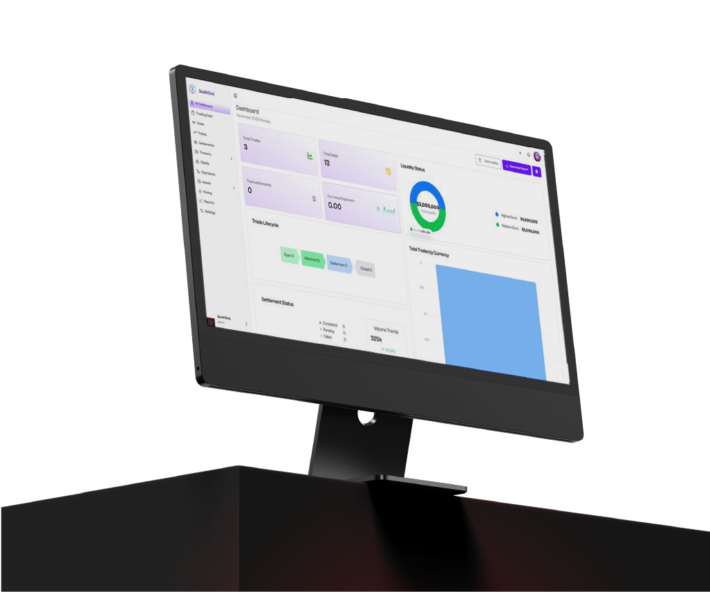 The system operates by giving a real-time, unified view of financial operations99. It uses a Trading Desk to monitor trades, deals, settlements, and conversions10. A Treasury Dashboard instantly views balances across all vaults in USD equivalent11. It includes automation for risk alerts12. It also features Audit Trails, logging every action for complete transparency13. The core functionality is presented through these two main features, suggesting a web-based platform14141414.